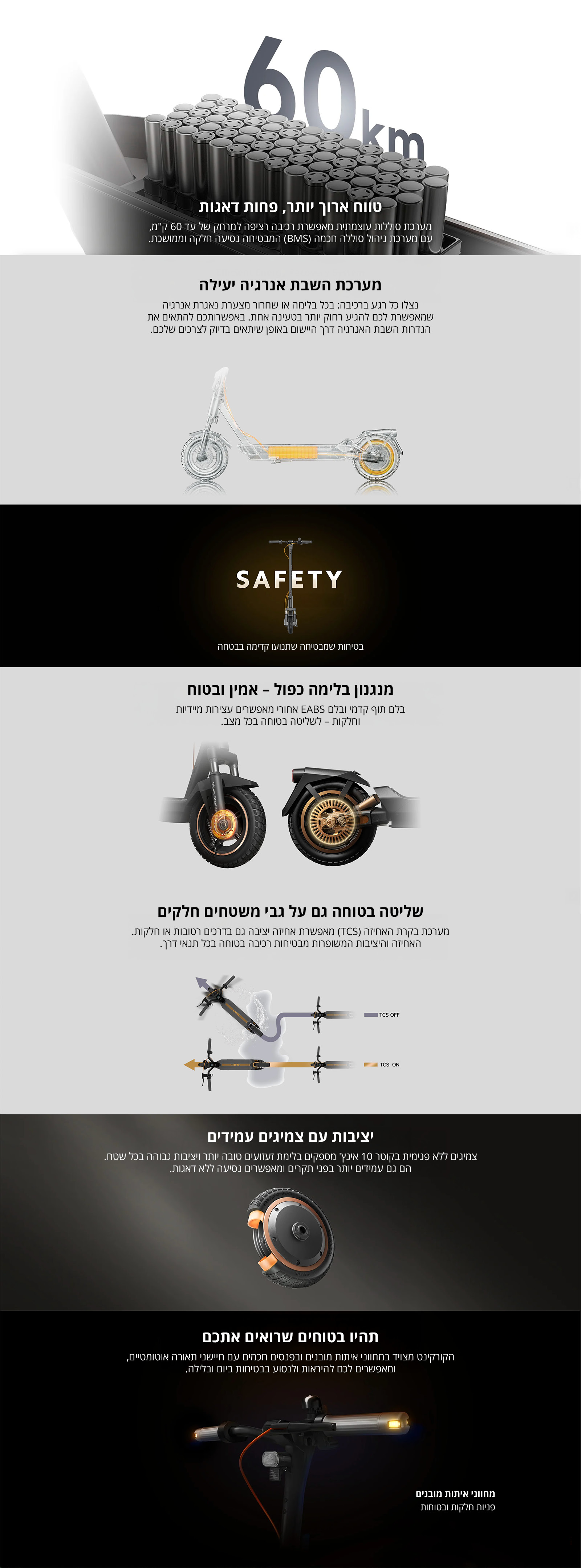 מרחק רכיבה מירבי של עד 60 ק"מ.